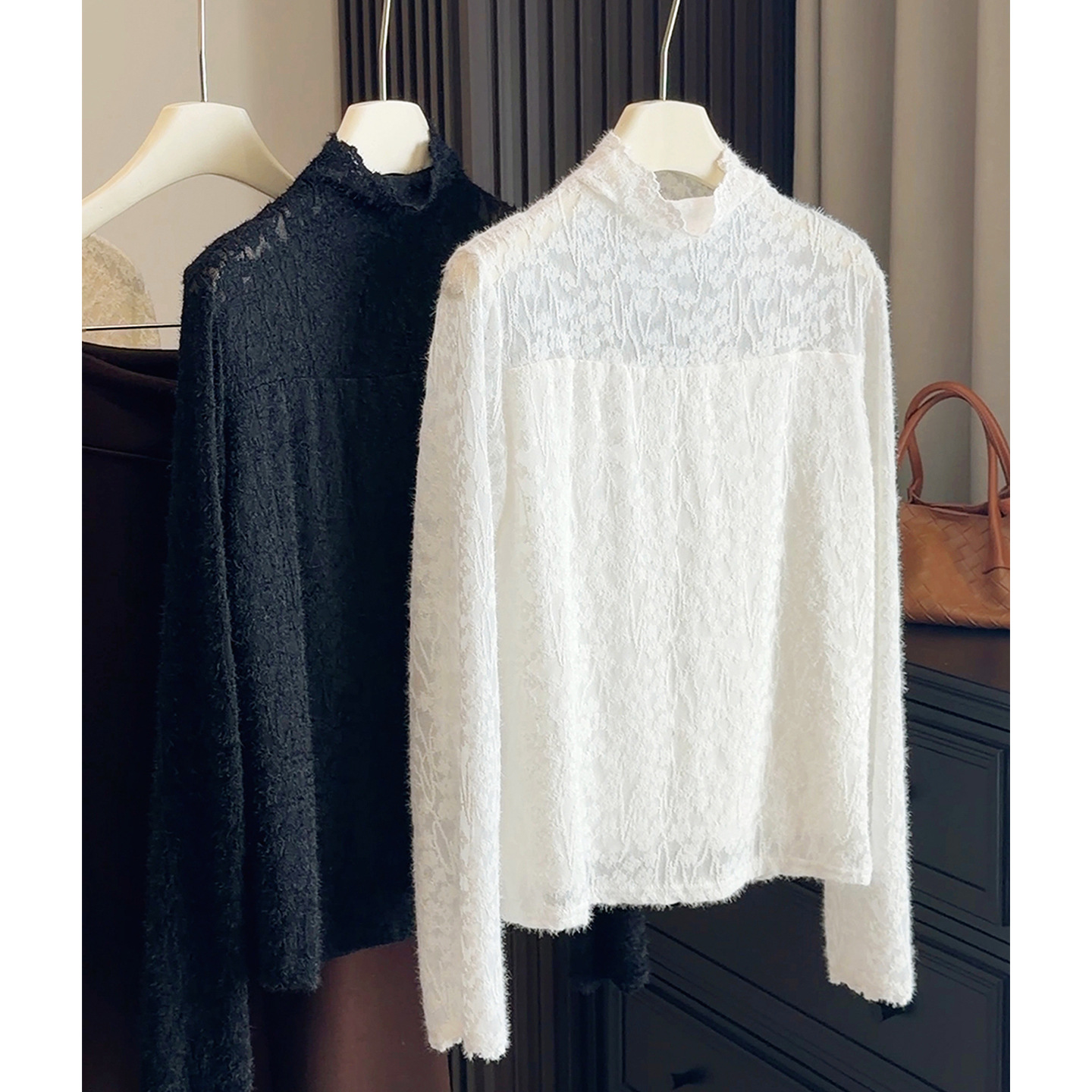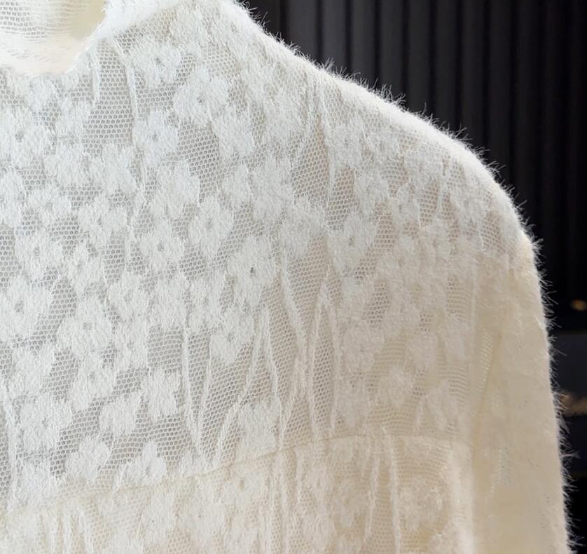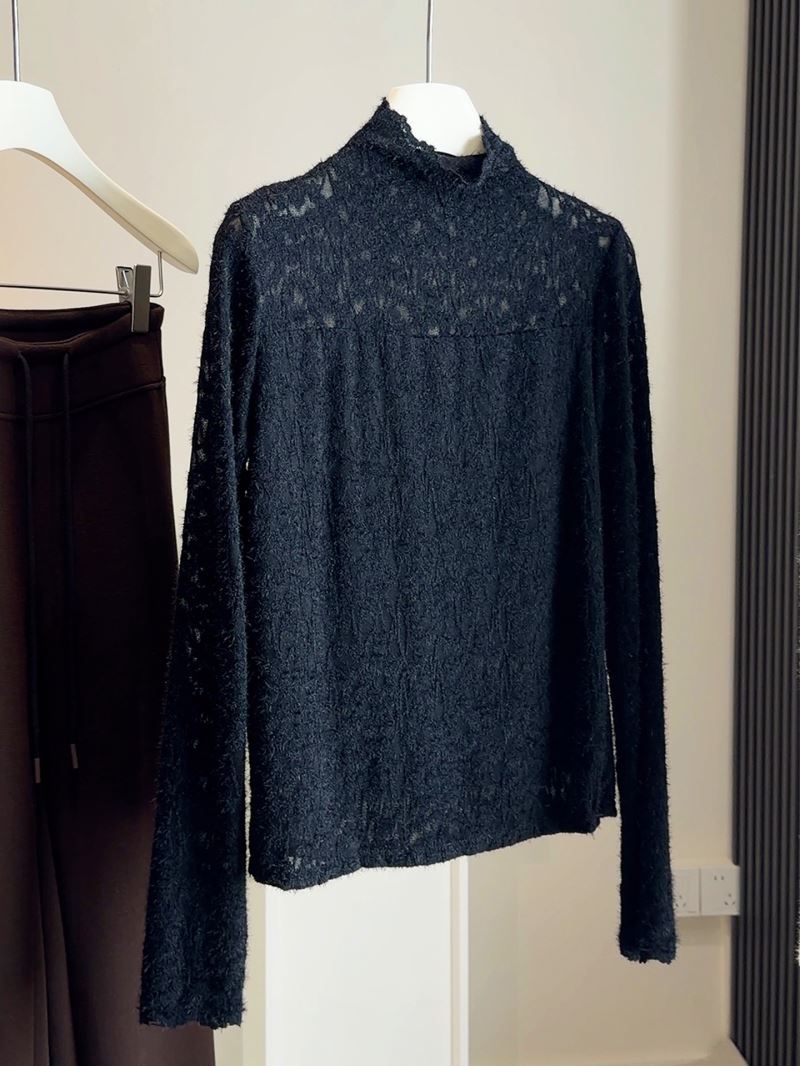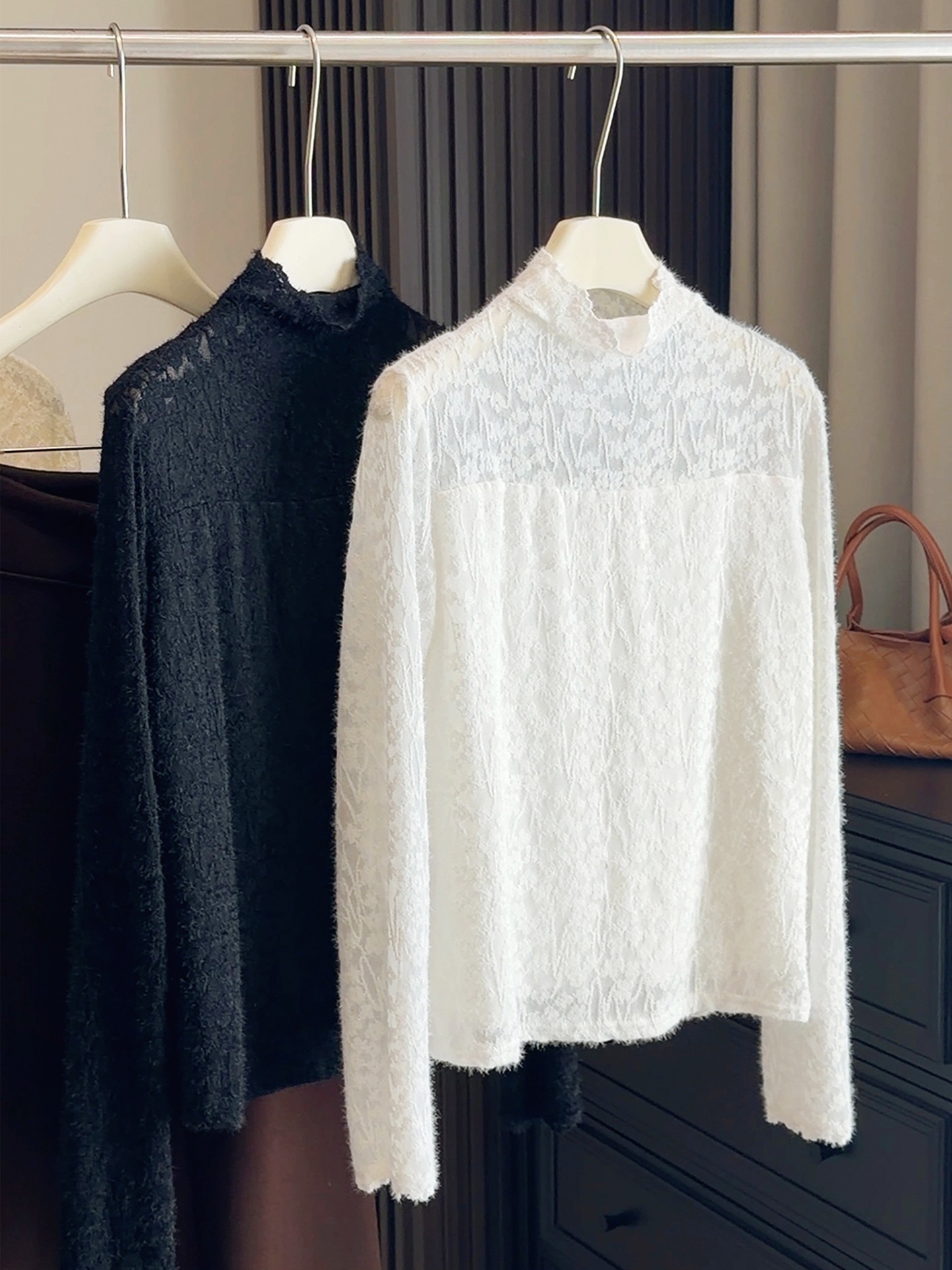 上品なレース編みが美しく、ハイネックデザインで首元まで暖かく包み込みます。